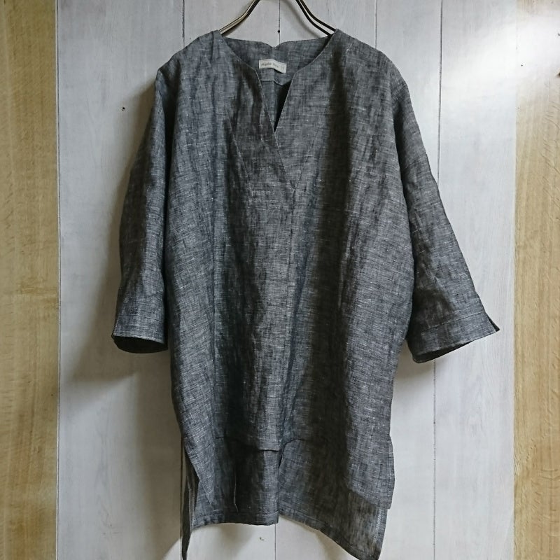 Vに切り込んで重ねた衿ぐりと前後差のある裾ラインが特徴のプルオーバーブラウスです。