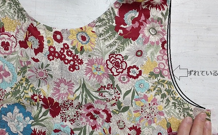 身頃と見返しをきちっと裁断して、きちっと縫い合わせても、若干のずれは出てきます。そのずれを調整しないまま縫い合わせると、ねじれなどが出てきます。