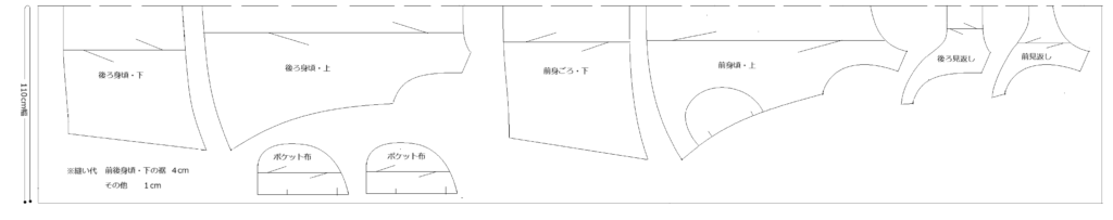 縫い代は裾が4cm、それ以外は全て1cmです。