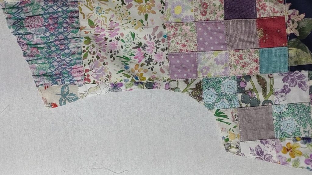 何も考えずにつなぎ合わせていったら、例えば衿ぐりになる位置、特に型の縫い合わせの位置に細かくパッチワークした部分がくると、縫いしろが重なってしまいます。