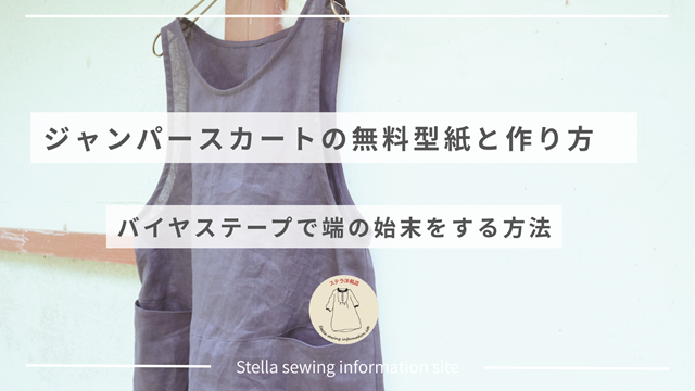 この記事ではジャンパースカートの型紙(無料)大人サイズLL~3Lの書き方と縫い方のポイントでは端をバイヤステープで始末する方法を解説します。