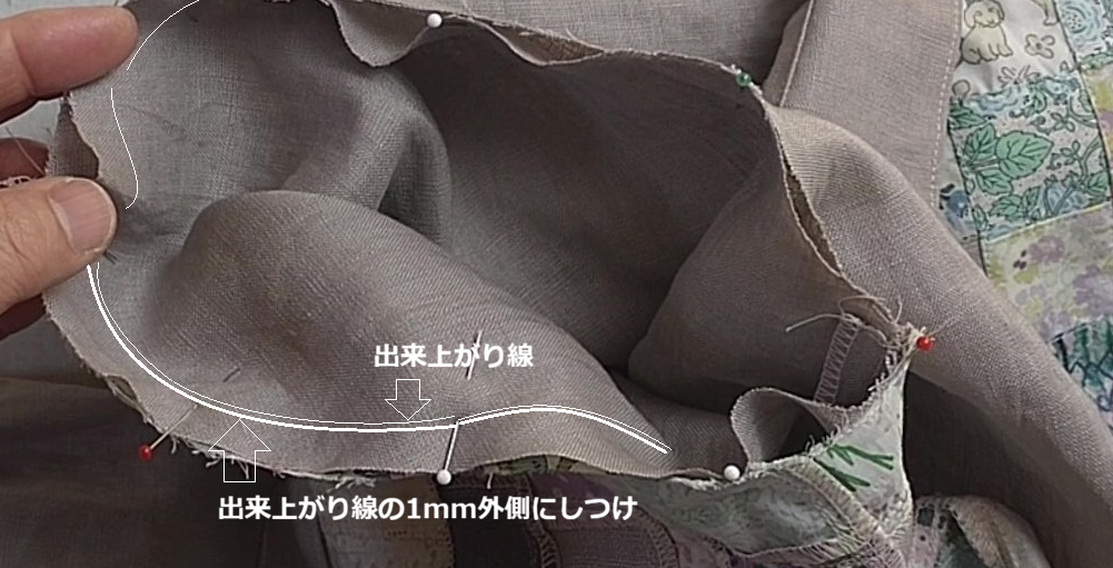 しつけをする位置は、まち針で固定した出来上がり線よりも1mm外側です。1mm外側にしつけをするのはミシンで縫った後にしつけ糸を外しやすくするためです。