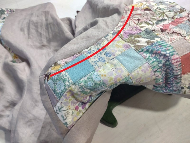 袖付けが難しい理由は、まず「凹カーブと凸カーブを縫い合わせる」という形の違いにあります。さらに、袖と身頃では布端(縫い代)の長さがぴったり同じではないため、その差をうまくなじませながら縫う必要があります。