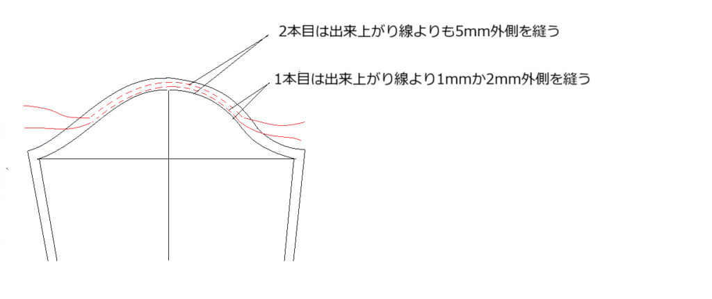 - 1本目 出来上がり線から1〜2mm外側(縫い代側)。これがイセ込みの最も重要な基準線となります。